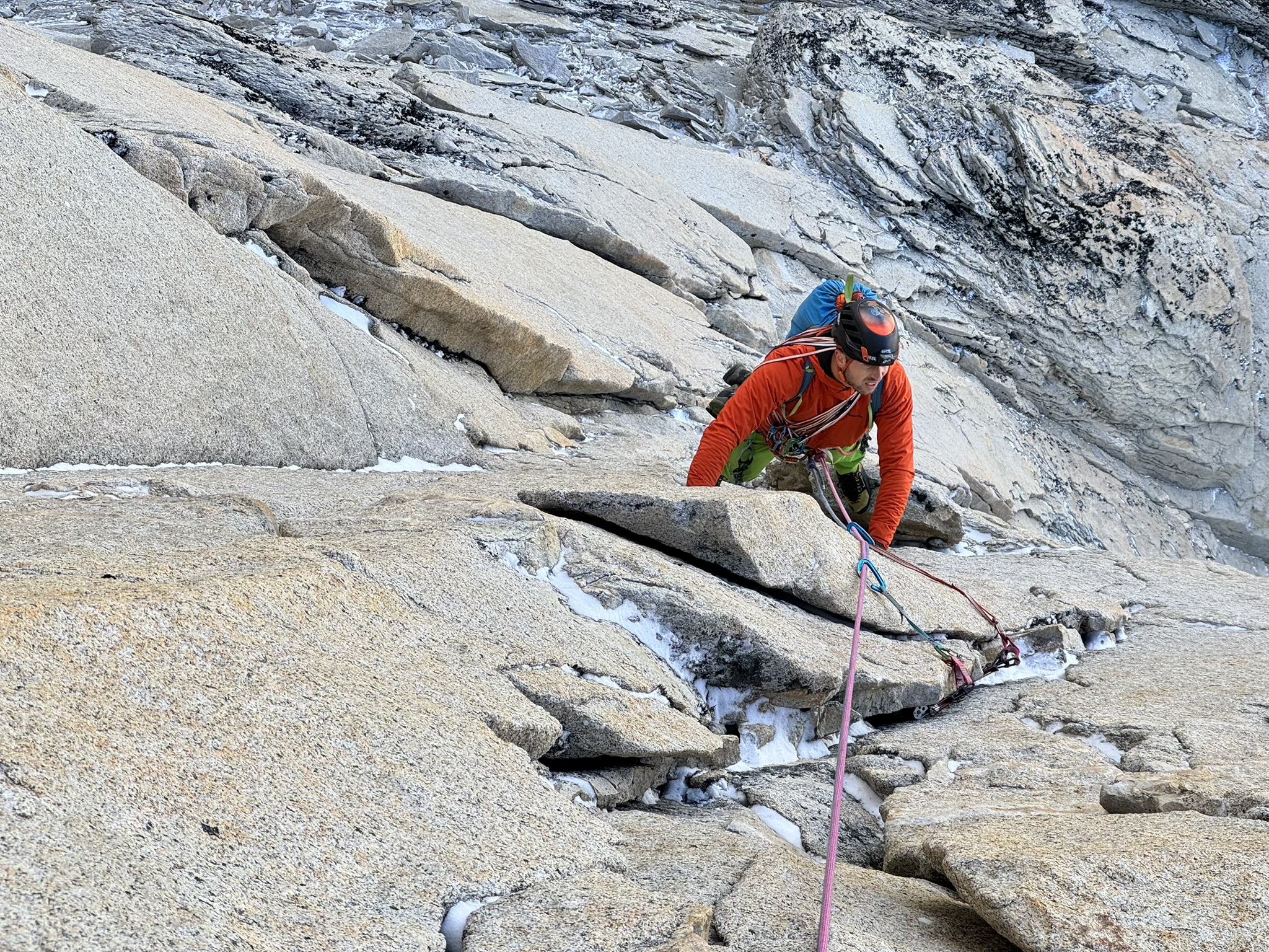 A las 8:30 h Rubén toma el testigo y comienza con el primer largo, se mueve eficientemente y confiado, puedo notarlo por la distancia de los seguros. Quizás esa confianza y lo delicado de la vía por los restos de nieve, hacen que resbale y vuele. Comenta que todo está bien y continúa escalando, en pocos minutos está en la reunión y yo comienzo a prepararme para subir. Mientras escalo no puedo creer las condiciones, el frío me adormece manos y pies, tirito mientras escalo y todas las tomas tienen nieve y verglass (esa fina capa de hielo que se posa sobre la roca) este día soñado se estaba haciendo un poco una pesadilla. Entre toda la incomodidad llego a la reunión con más ganas de abandonar que de otra cosa. Rubén me da ánimos, me traspasa el material y sin mucho pensar, sino más bien de forma instintiva continuo con el siguiente tramo. La primera parte es muy disfrutable, pero luego un tramo muy descompuesto exige precisión y calma, cualquier roca suelta tiene muchas chances de caer sobre mi cordada. Un pequeño paso de travesía muy fino y continúo unos metros hasta la reunión, en nada Rubén está conmigo listo para afrontar el siguiente largo.