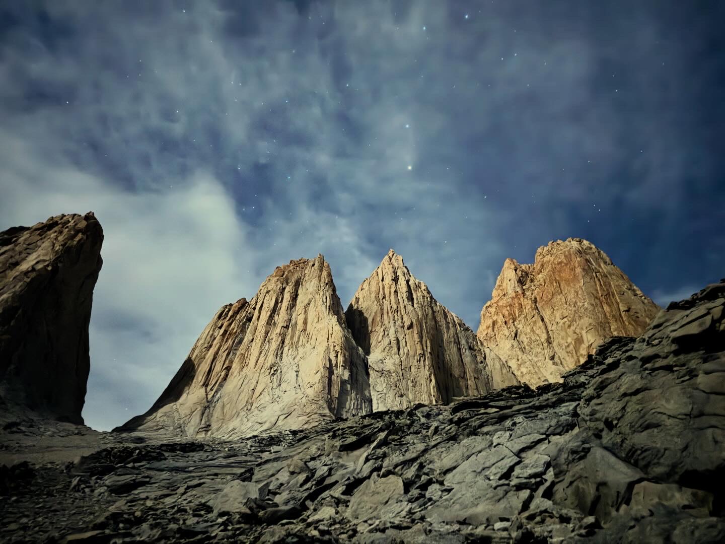 Son las 04:00 am y suena la alarma, nos sentimos frescos, el cuerpo liviano, el ánimo arriba. Es el día, ese día por el que trabajamos por bastante tiempo, ese día con el que soñamos, en mi caso desde hace años. El plan es un poco distinto, hemos cambiado Taller del sol por Homenaje, una vía más corta y en la que además va otra cordada que conoce la aproximación. Rubén a fundir nieve para el desayuno, yo preparando los potajes de avena y fruta, ordenando el vivac y preparando todo para salir. A las 5:30 h los chicos del CAB pasan por nosotros y comenzamos la caminata por una empinada morrena, montándonos sobre rocas que son los vestigios de lo que alguna vez fue parte de las torres. Comienza a amanecer y con ello la temperatura desciende, caminado no se siente frío, pero claramente será un día estricto climatológicamente hablando. La noche anterior llovió y nevó, la baja temperatura hace que aún de día quede nieve y el frío se cuele por nuestras extremidades. Después de 1 h de caminata estamos en el comienzo de una zona donde nos encordamos para luego de unos 80 m de trepada nos encontremos al pie de vía. La otra cordada conocía la aproximación y nos ayudaron a llegar hasta allí, así que nos parece justo que sean ellos quienes comiencen la escalada.