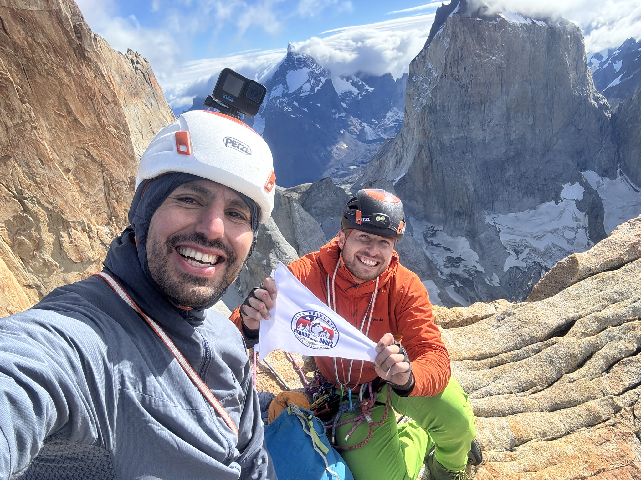 Entre la incomodidad del frío y anhelando el más pequeño rayo de sol, continuamos la escalada, todo muy silencioso. Cada uno sabe lo difícil que está siendo la vía y aunque siempre cantamos y bromeamos, este día discurre de forma diferente, solo se escucha el movimiento de los seguros y su golpeteo sobre la roca. A eso de las 16:30 h estamos saliendo a la zona alta de la torre norte, nos quedan 300 m de trepadas y el largo cumbrero. De forma casi providencial el calor del sol se posa sobre nosotros, con ello surge la alegría y el desenfado. Lo difícil ya está hecho, ahora queda ser eficientes y cobrar el premio. Afrontamos las trepadas encordados avanzando tramos en ensamble, de forma rápida y sin contratiempos, disfruto correr sobre la roca, avanzar sin pensar más que cada cierto rato en poner algún seguro por las dudas. Luego en un momento estamos al pie del largo cumbrero. A decir verdad, me hago un poco el loco para que Rubén lo lidere, aunque es retrospectiva creo que le terminé dando un gran regalo. Ordenamos el material y comienza con eso últimos 12 m de placa que se deja escalar y permite coronar la cumbre. En unos minutos escucho su grito y no queda más que disfrutar la emoción, escalo rápidamente y ya nos encontramos en la cumbre. El día ha despejado, no hay viento, es el mejor regalo luego de soportar el frío todo el día. Siguen los gritos, los abrazos y las fotos de rigor. Disfrutamos plenamente el momento, compartimos algo de comida mientras baja la euforia y damos paso brevemente a la reflexión, a los sentimientos profundos que nacen del logro, de ver materializado el compromiso, la organización y el arduo entrenamiento. La cumbre de la torre norte nos acepta y nos permite disfrutar del sobrecogedor paisaje que frece el parque, lleno de montañas, lagunas, frondosos valles e imponentes glaciares.